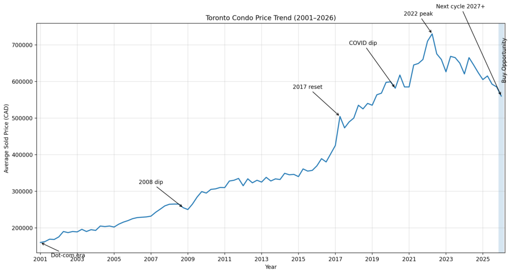 Real estate moves in cycles. The Toronto condo market has already recovered from its 2022 peak, creating a rare entry point. Historically, buyers who enter during downturns benefit the most as the market stabilizes and enters its next growth phase. With early signs pointing to the next cycle beginning around 2027+, 2026 represents a strategic window to buy before prices rebound.